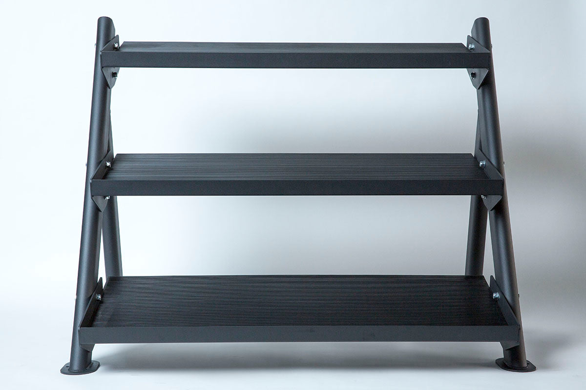 El rack de mancuernas American Barbell de 3 niveles mantiene tus mancuernas colocadas de forma uniforme, compacta y segura.